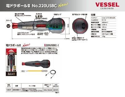 ベッセル 電ドラボールII ビット(+2×100)1本付属 No220USBC-1