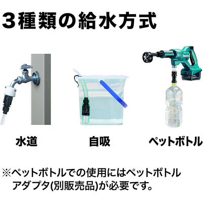 水道直結の他、ため水(自吸)、ペットボトル※からの給水も可能で、水道設備がない場所でも洗浄作業が行えます。