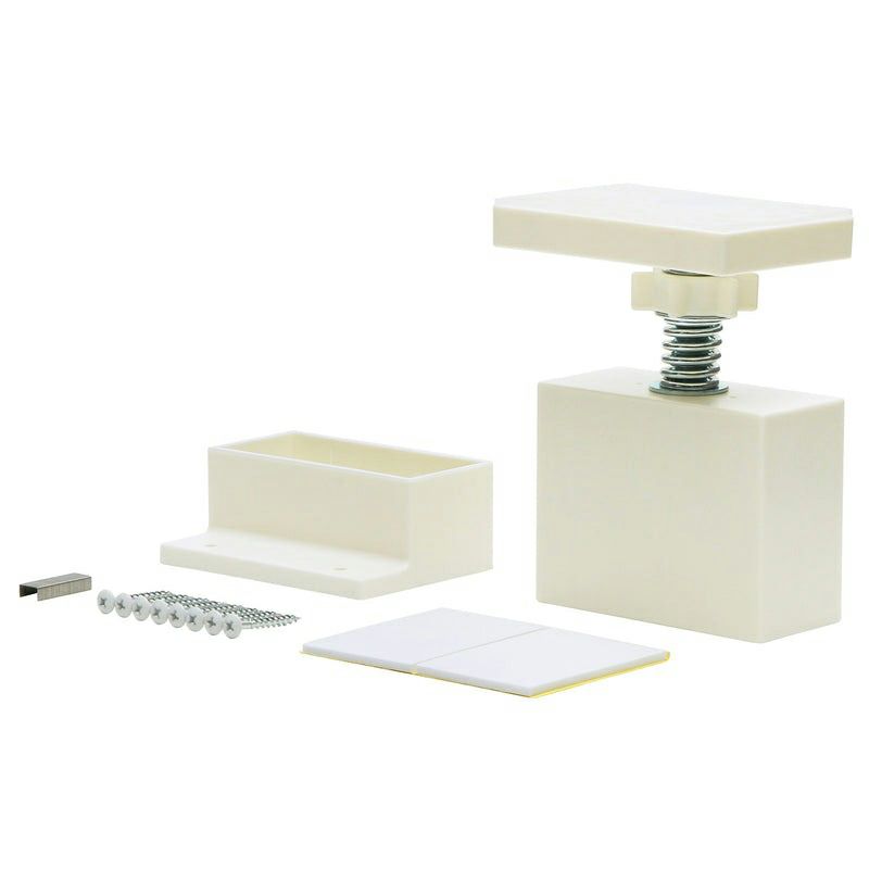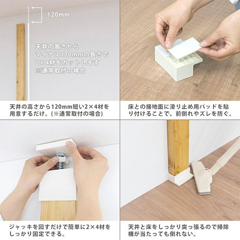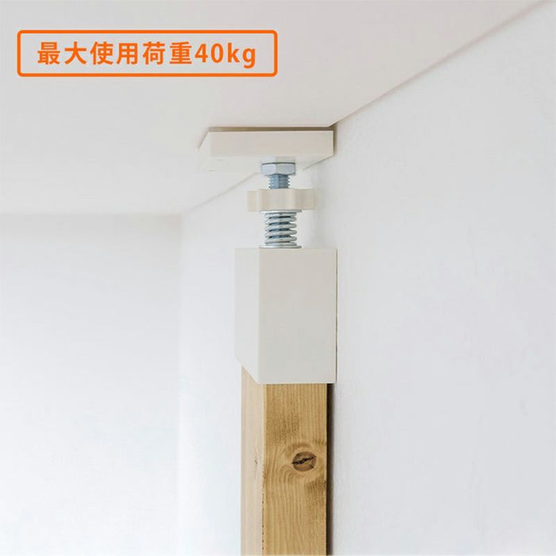 天井面へはホッチキス留めで固定、床との接地面は滑り止め用にパッドを取付けることで、物を繰り返し掛けたり、前にせり出した棚の使用など、いわゆる「動荷重」が想定される使い方でも、ズレや転倒を防げる安全設計にパワーアップしました。
