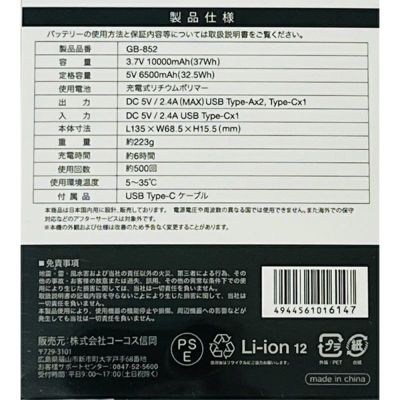 出力: DC5V/2.4A(MAX) USB Type-A×2、Type-C×1