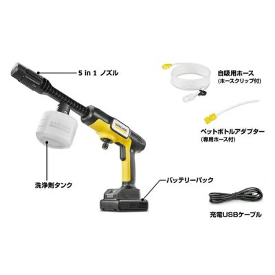 標準装備品洗浄剤タンク、5 in 1ノズル、5m 自吸用ホース(ホースクリップ付)、バッテリーパック 18V/2.0Ah、ペットボトルアダプター、充電USBケーブル(ACアダプターなし)