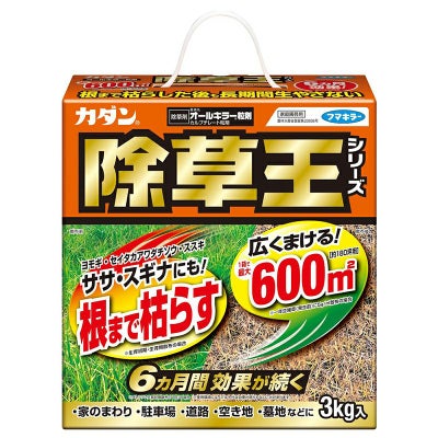 3kg入りで最大600平方メートルまで一度にまくことができ、広範囲の雑草の発生を防ぎます。