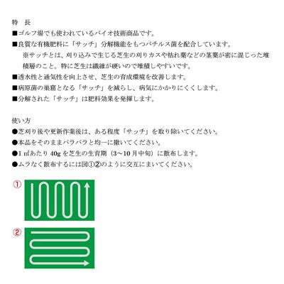 そのままパラパラ撒くだけで、サッチ(芝生の刈りカスや枯れ葉などの茎葉が密に混じった堆積層)を分解し、健全な芝生の育成をお手伝いします。