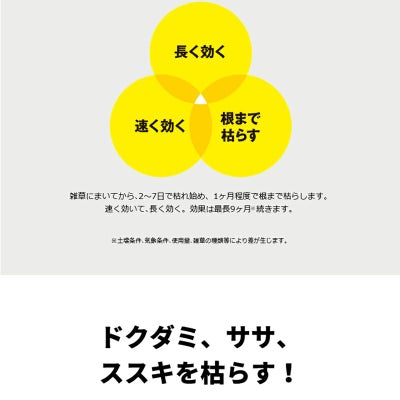 ■2~14日で枯れ始め、さらに約5~9ヶ月間雑草の発生を抑えます。