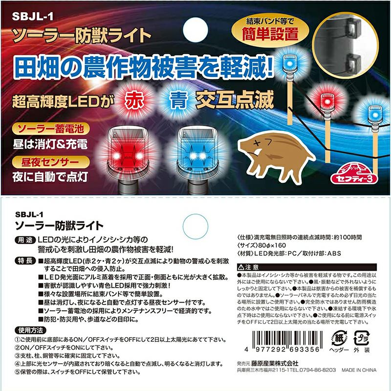 セフティー3 ソーラー式防獣ライト 青 赤 LEDライト 昼夜センサー SBJL-1