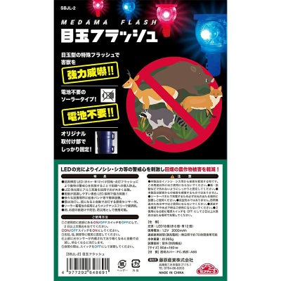 超高輝度LED(赤6ヶ・青12ヶ)が回転・点灯フラッシュにより動物の警戒心を刺激することで田畑への侵入防止します。