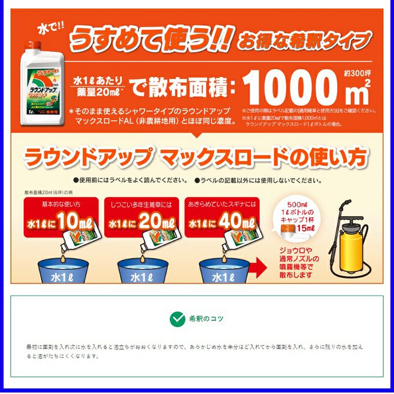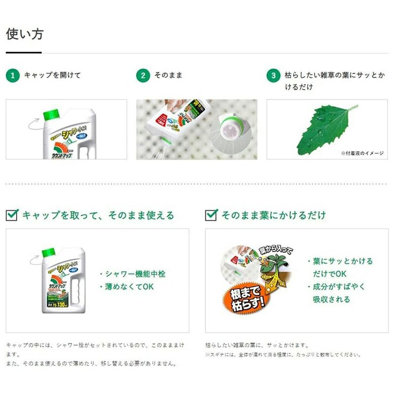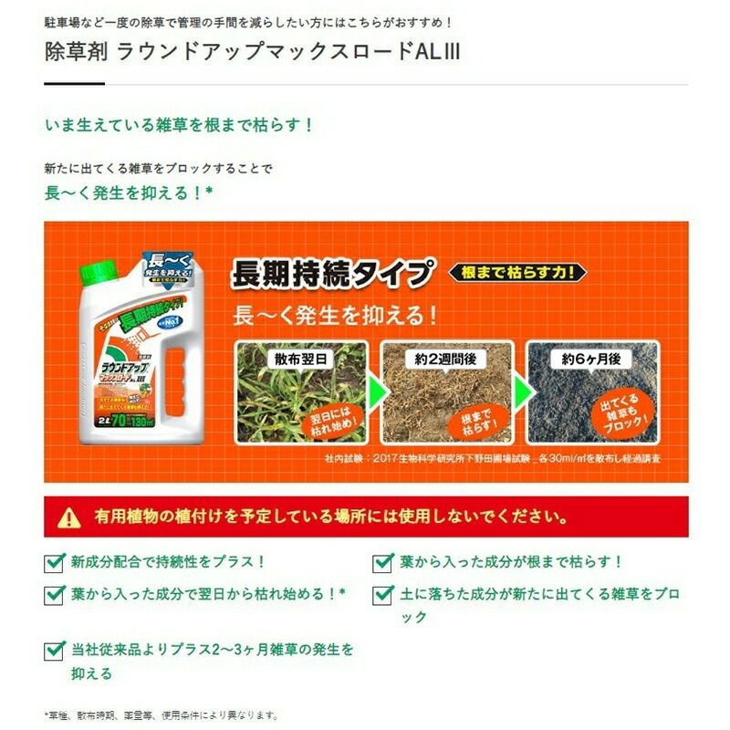 他の画像を見る 【ejoy数量限定特別セット】 日産化学工業 ラウンドアップマックスロード AL III シャワータイプ 2L 除草剤 + ラウンドアップオリジナルタオル + はじめてガイド冊子 プレゼント 当店特別価格 ¥ 1,980 税込 カートに入れる お気に入りに登録する