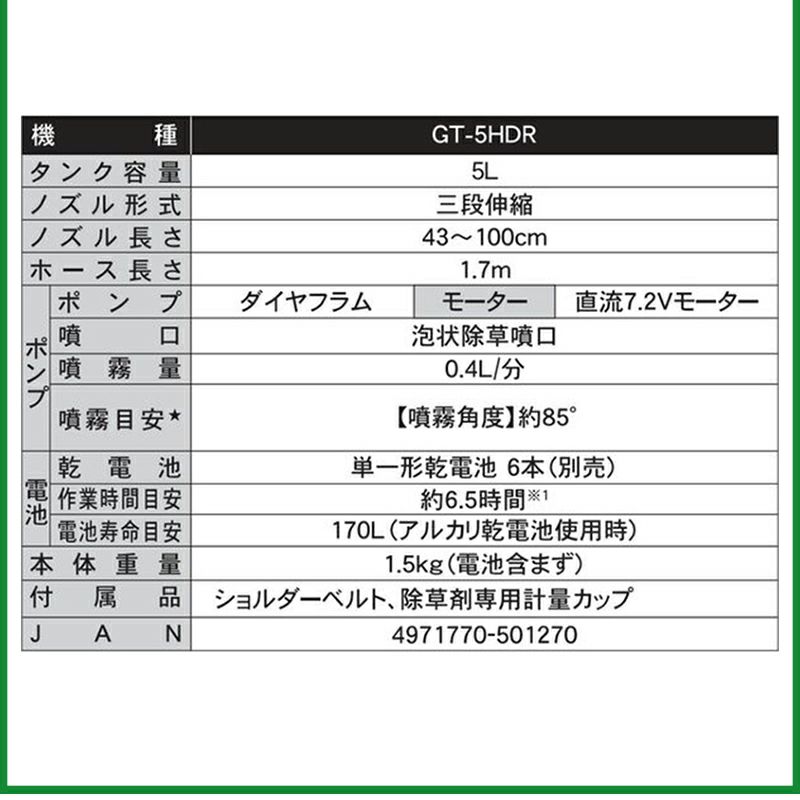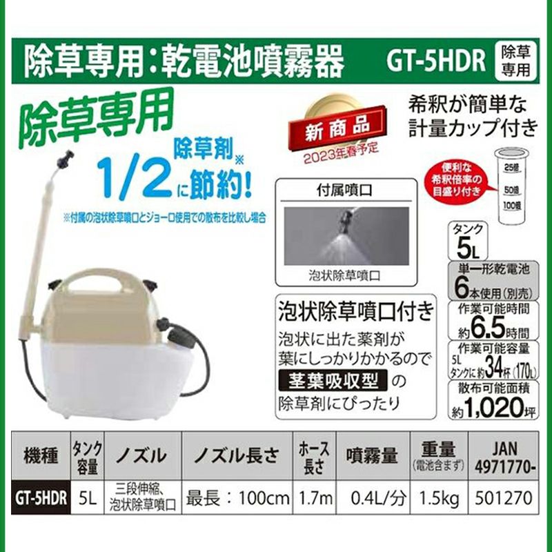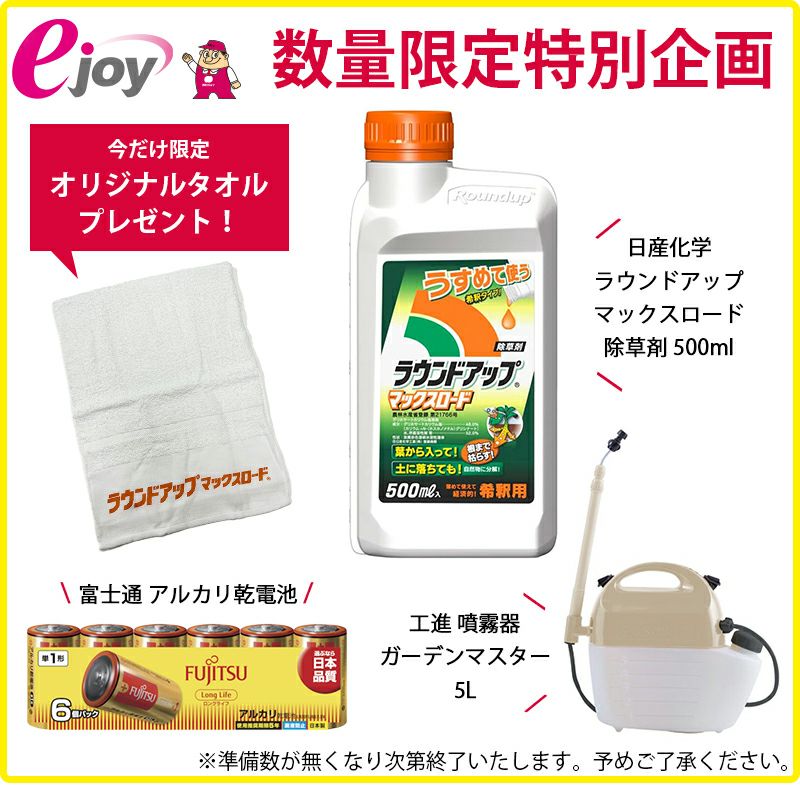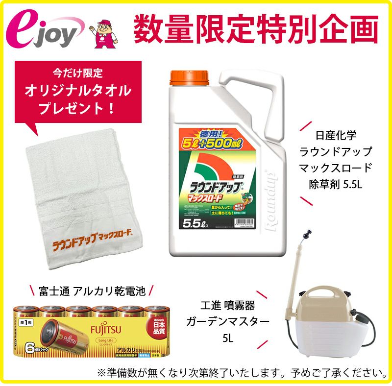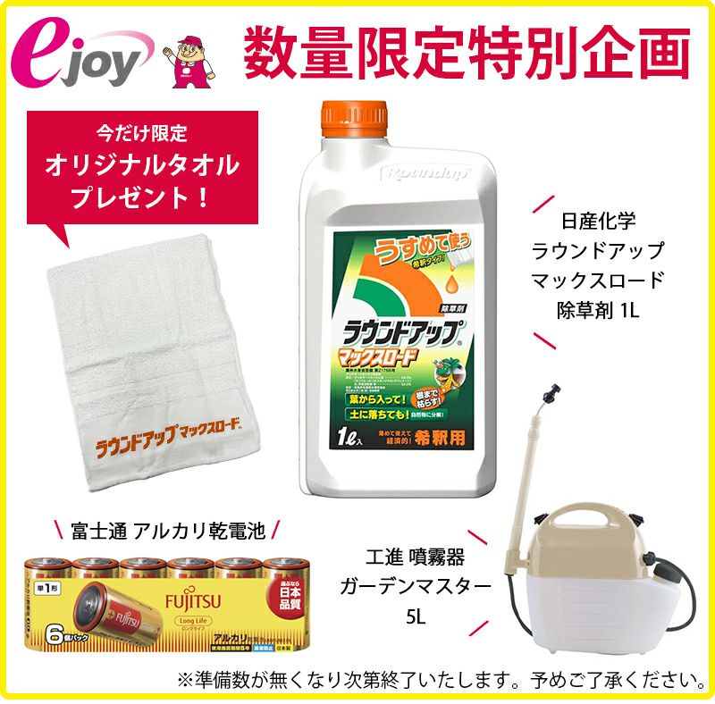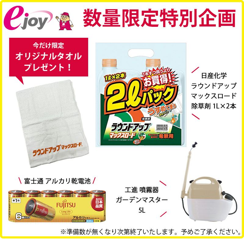 他の画像を見る 【ejoy数量限定特別セット】 日産化学 除草剤 ラウンドアップマックスロード 5.5L + 工進 噴霧器 ガーデンマスター 5L GT-5HDR + 富士通 アルカリ乾電池 ロングライフ 単1形 6個パック + オリジナルタオル + 計量カップ + 希釈表 プレゼント 送料無料 当店特別価格 ¥ 18,800 税込 詳細を見る お気に入りに登録する