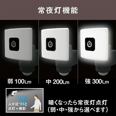 常夜灯 : 100ルーメン (弱)、 200ルーメン (中)、 300ルーメン (強) |