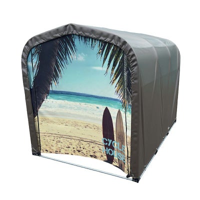 ・従来モデル(サイクルハウスSB)の前幕をリニューアル。厚みのあるターポリン生地に、インクジェットプリントで独自デザインを採用。他にはない高級感と個性を演出します。
