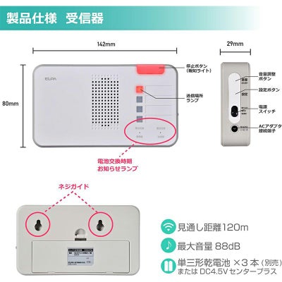 ●電波の到達距離は見通し約120m。一般家庭や店舗・事務所における呼び出しや報知用に最適です。