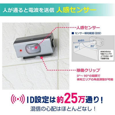 ●配線が不要なワイヤレスタイプなので設置が簡単!用途に合わせて送信器・受信器の増設も可能です。