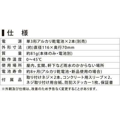 ■ 付属品:取り付けネジ×2本、コンクリート用スリーブ×2、ネジ取り付け用台紙、防犯ステッカー1枚、保証書