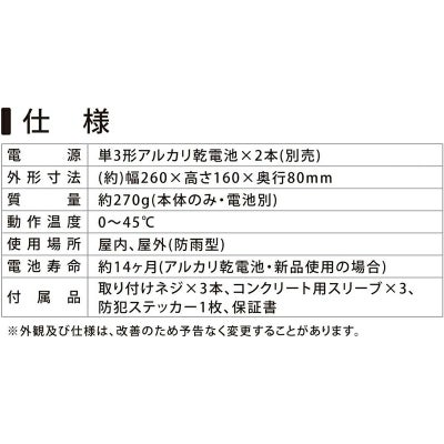 ■ 付属品:取り付けネジ×3本、コンクリート用スリーブ×3、防犯ステッカー1枚、保証書