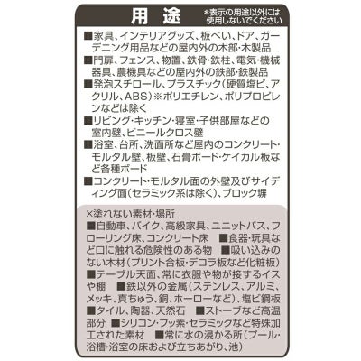用途:木、木製品、鉄、鉄製品、コンクリート(床は除く)、ビニールかべ紙、プラスチック(一部除く)