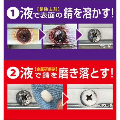 【1液:錆除去剤】で金属表面の赤錆を化学反応で溶かし、【2液:金属研磨剤】で残った錆をしっかりと磨き落とします。