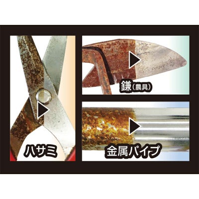 素地の金属(鎌、ハサミ、ノコギリなど)、鋼、アルミのサビや、ネジ、ボルト、車体、農具、スキー板などの部分的な箇所まで幅広い錆に対応します。