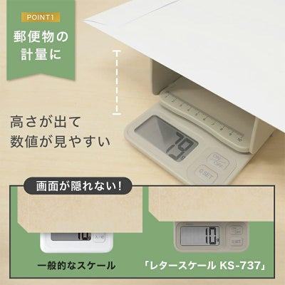 荷物や封筒などの計量も計量皿を立てれば、画面が隠れて見えなくなる心配がありません。
