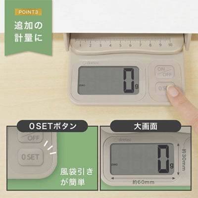 0表示機能で、容器の重さを差し引いて中身だけの重さをはかれるため、追加計量も可能です。
