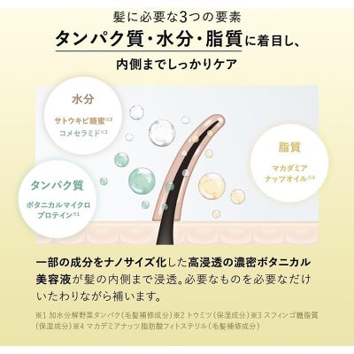 水、セタノール、ジメチコン、グリセリン、DPG、ベヘントリモニウムクロリド、アボカド油、シラカンバ樹液、ガラクトミセス/シラカンバ樹液発酵液、マカデミアナッツ脂肪酸フィトステリル、加水分解野菜タンパク、トウミツ、スフィンゴ糖脂質、グリチルリチン酸2K、ブドウ種子エキス、テルミナリアフェルジナンジアナ果実エキス、ホホバ種子油、ヨーロッパキイチゴ果実エキス、酒粕エキス、加水分解ヒアルロン酸、セラミドNG、加水分解ケラチン(羊毛)、アルギニン、ヒアルロン酸Na、イソアルキル(C1040)アミドプロピルエチルジモニウムエトサルフェート、リンゴ酸、PEG30フィトステロール、水添レシチン、フィトステロールズ、水添リゾレシチン、イソステアリン酸イソステアリル、ジリノール酸ジイソプロピル、BG、PPG4セテス20、PEG40水添ヒマシ油、ペンチレングリコール、ヘキシレングリコール、ジステアリルジモニウムクロリド、ベヘントリモニウムメトサルフェート、ステアルトリモニウムクロリド、アモジメチコン、乳酸、EDTA2Na、エタノール、イソプロパノール、トコフェロール、安息香酸Na、香料