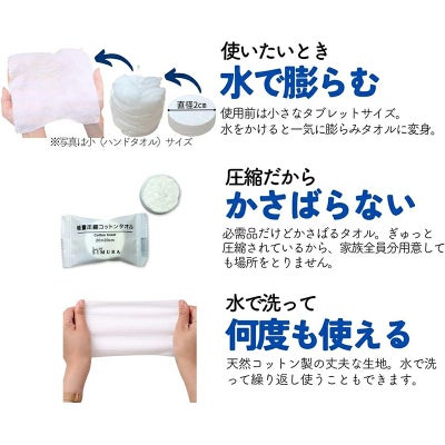 ●水で簡単に膨らむ!携帯に便利な圧縮コットンタオルです
