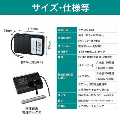 イヤホン使用時(目安):AM…約350時間 / FM…約270時間