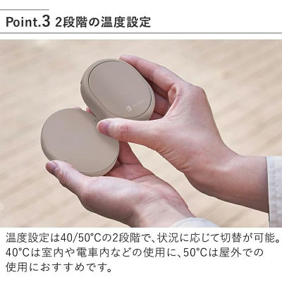 温度設定は40/50℃の2段階で、状況に応じて切替が可能。40℃は室内や電車内などの使用に、50℃は屋外での使用におすすめです。