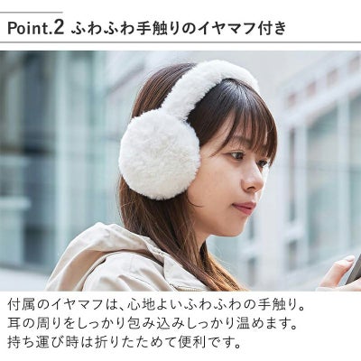 付属のイヤマフは、心地よいふわふわの手触り。耳の周りをしっかり包み込みしっかり温めます。持ち運び時は折りたためて便利です。