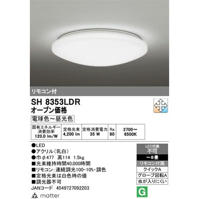 オーデリック LED シーリングライト 調光 調色 8畳 リモコン付 SH8353LDR