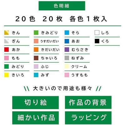 【カラー】20色(きん、ぎん、あか、もも、みどり、きいろ、きみどり、うすだいだい、きだいだい、ちゃいろ、ふじ、みず、そら、あお、むらさき、ねずみ、クリーム、うすもも、しろ、くろ)