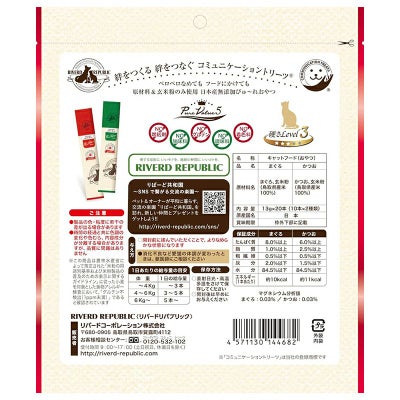 かつお:たんぱく質6.0%以上、脂質2.5%以上、粗繊維0.5%以下、灰分1.5%以下、水分84.5%以下、エネルギー約11kcal/本