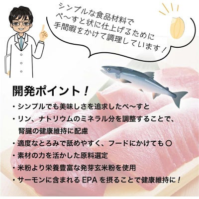 まぐろ、サーモン、天然水(鳥取県産奥大山の水使用)、発芽玄米米粉、ほたてだし粉末