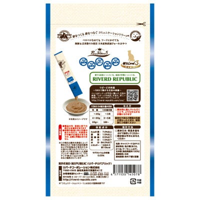 たんぱく質7.0%以上、脂質1.5%以上、粗繊維0.5%以下、灰分1.5%以下、水分84.0%以下、エネルギー約10kcal/本