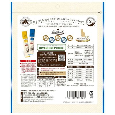 海鮮ミックス:たんぱく質7.0%以上、脂質1.5%以上、粗繊維0.5%以下、灰分1.5%以下、水分84.0%以下、エネルギー約10kcal/本