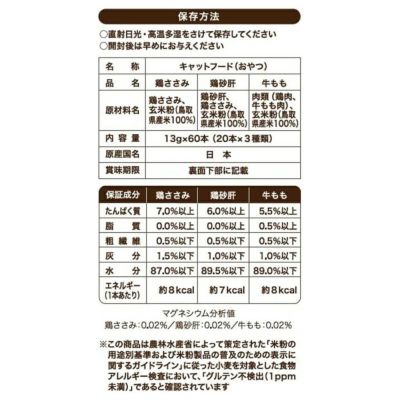 鶏ささみ:たんぱく質7.0%以上、脂質0.0%以上、粗繊維0.5%以下、灰分1.5%以下、水分87.0%以下、エネルギー約8kcal/本