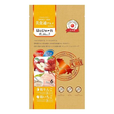 鶏りんご:鶏ささみ、米粉、天然水(鳥取県産奥大山の水使用)、りんご、にんじん、ほたてエキス調味料、マルトオリゴ糖、寒天、ビタミンE