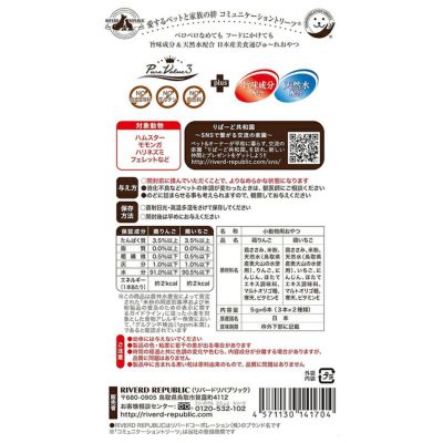 鶏りんご:たんぱく質3.5%以上、脂質0.0%以上、粗繊維0.5%以下、灰分1.0%以下、水分91.0%以下、エネルギー約2kcal/本