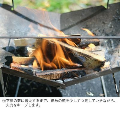 4.下部の薪に着火するまで、細めの薪を少しずつ足していきながら、火力をキープします。