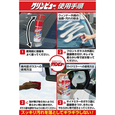 使用前に缶をよく振り、フロントガラスの外面に直接吹きつけ、きれいな柔らかい布で拭き取ってください。雨天時には、スプレー後、ワイパーを作動させてください。