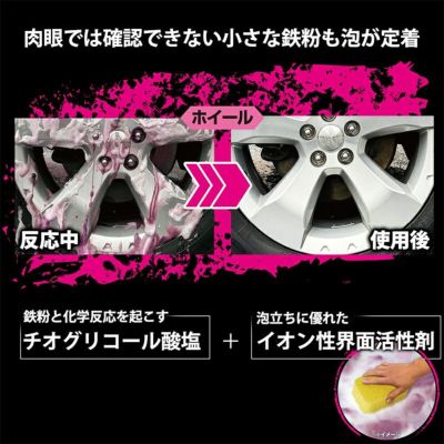 鉄粉を溶解する「チオグリコール酸塩」と泡立ちに優れた「非イオン系界面活性剤」のダブルパワーで、ボディー・ホイールに付着した頑固な鉄粉やダスト汚れを強力に溶解し、根こそぎ落とします。