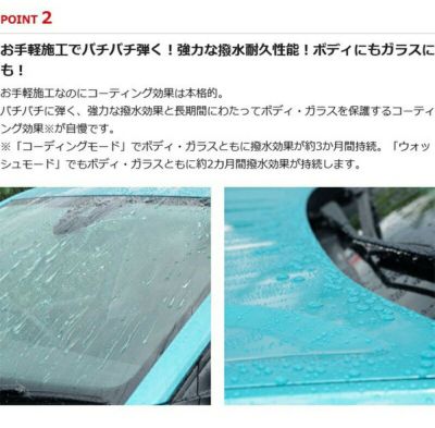 液剤を希釈し泡立てて使用する「ウォッシュモード」は、シャンプーのように洗車して汚れを落としつつ、同時に約2ヶ月耐久(※弊社テストによる)の撥水性能を発揮します。