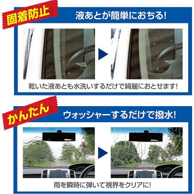 ウォッシャーするだけでフロントガラスを撥水コーティングし、雨を瞬時に弾きます。