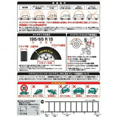セット内容:タイヤチェーン2本、手袋、補修パーツ1セット、サイドバンド、取扱説明書