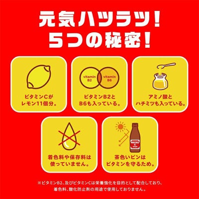 1本(120ml)当たり:エネルギー 79kcal、タンパク質 0g、脂質 0g、炭水化物 19g、食塩相当量 0g、ビタミンB2 2.4mg、ビタミンB6 4.9mg、ナイアシン 12mg、ビタミンC 220mg