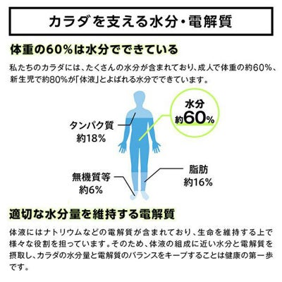 体液にはナトリウムなど電解質が含まれているため、カラダの水分量を適切に維持するには水分のみでなく、電解質の補給が重要です。